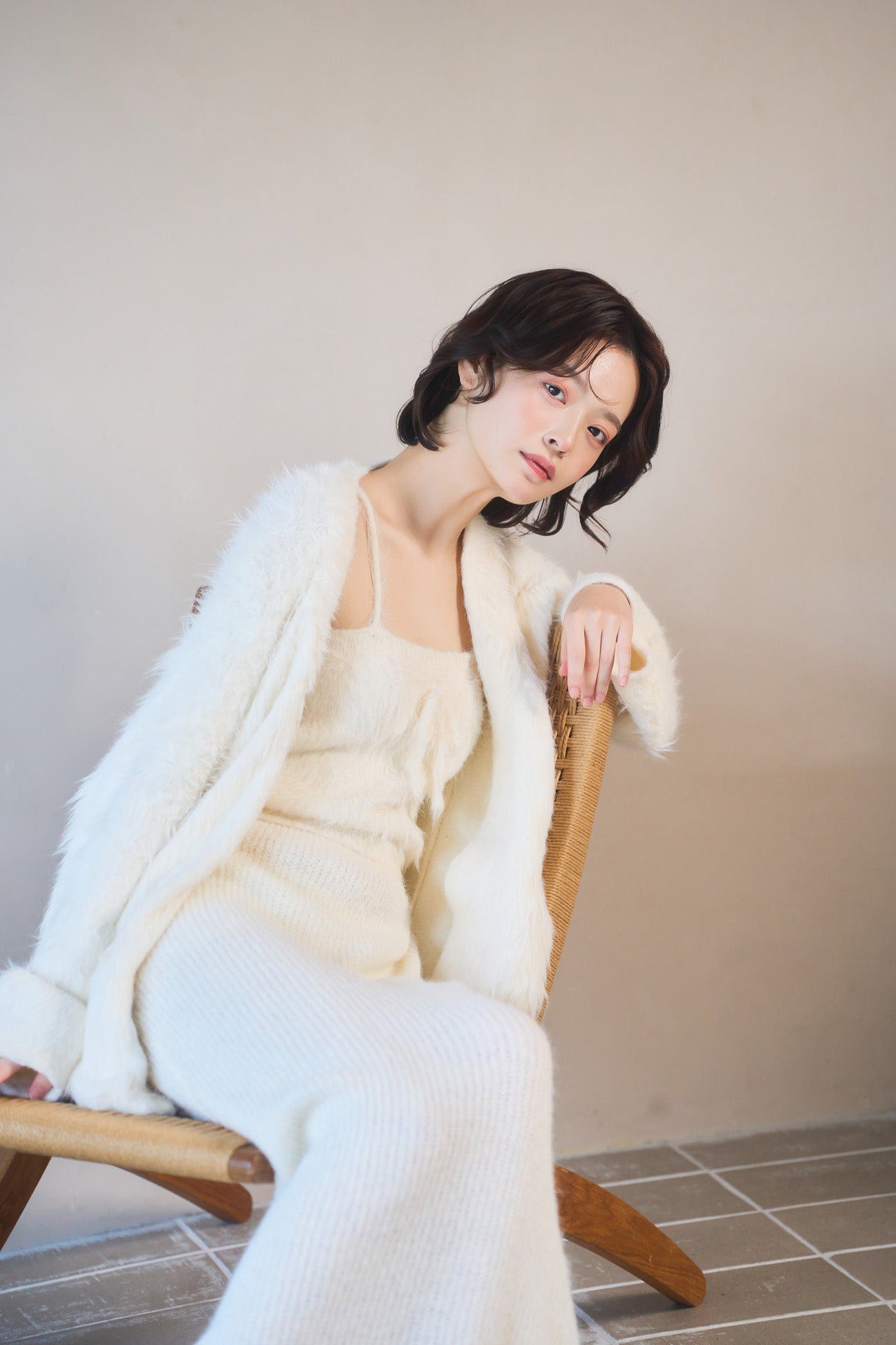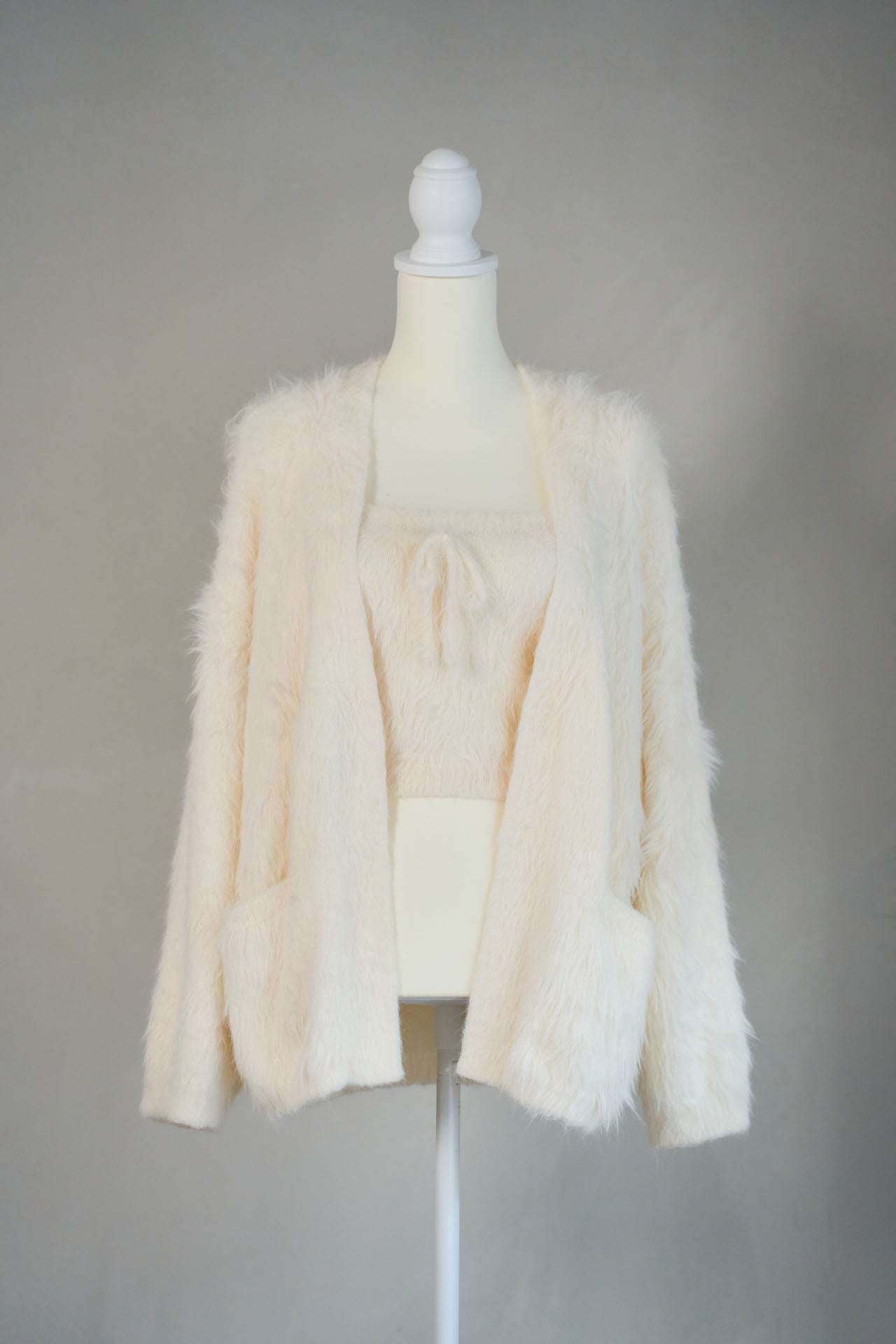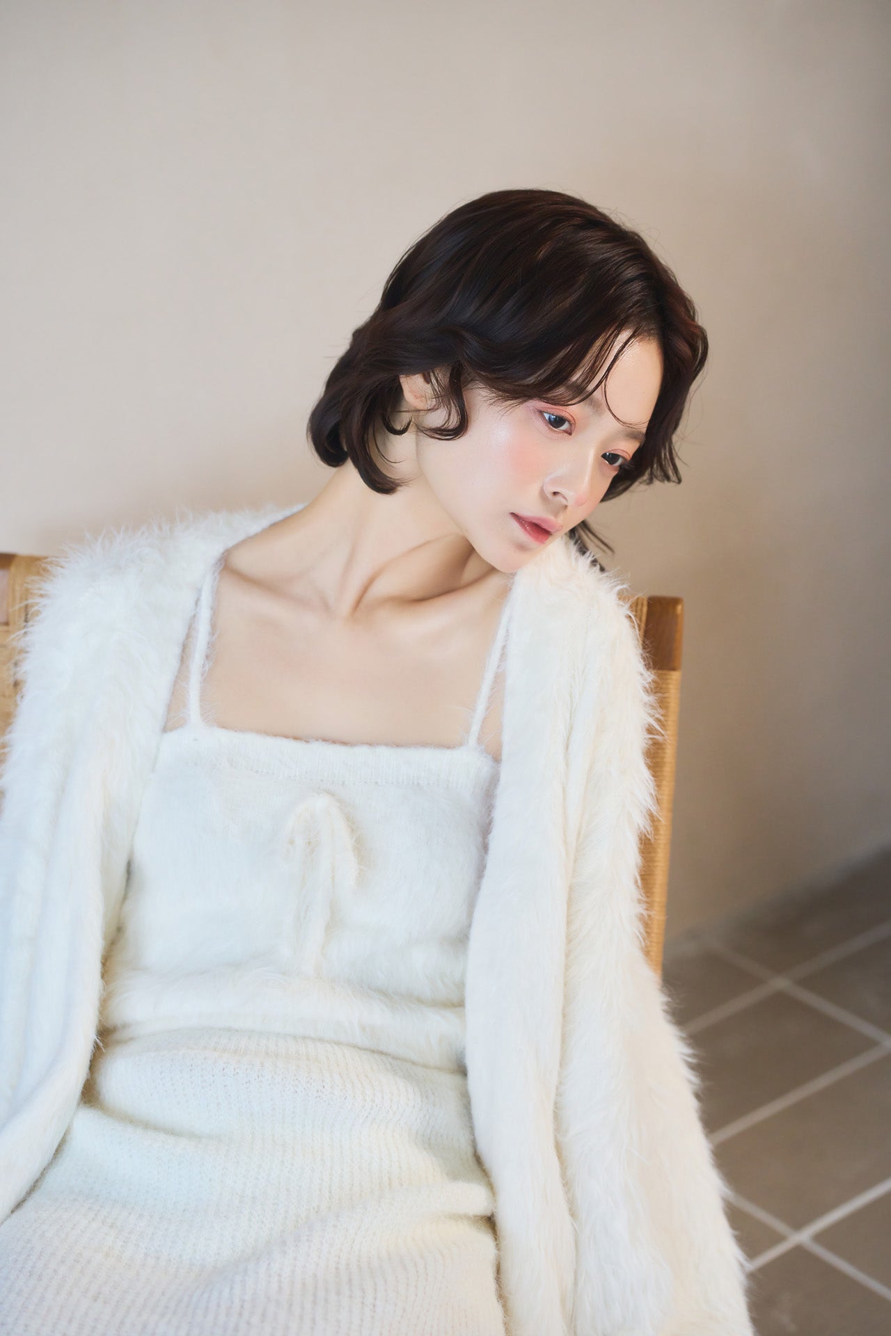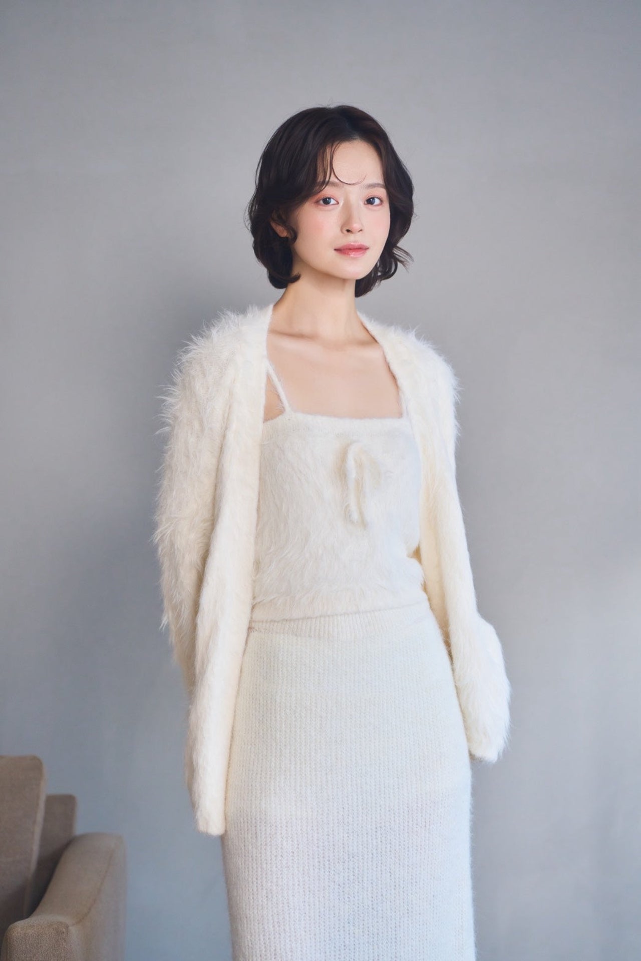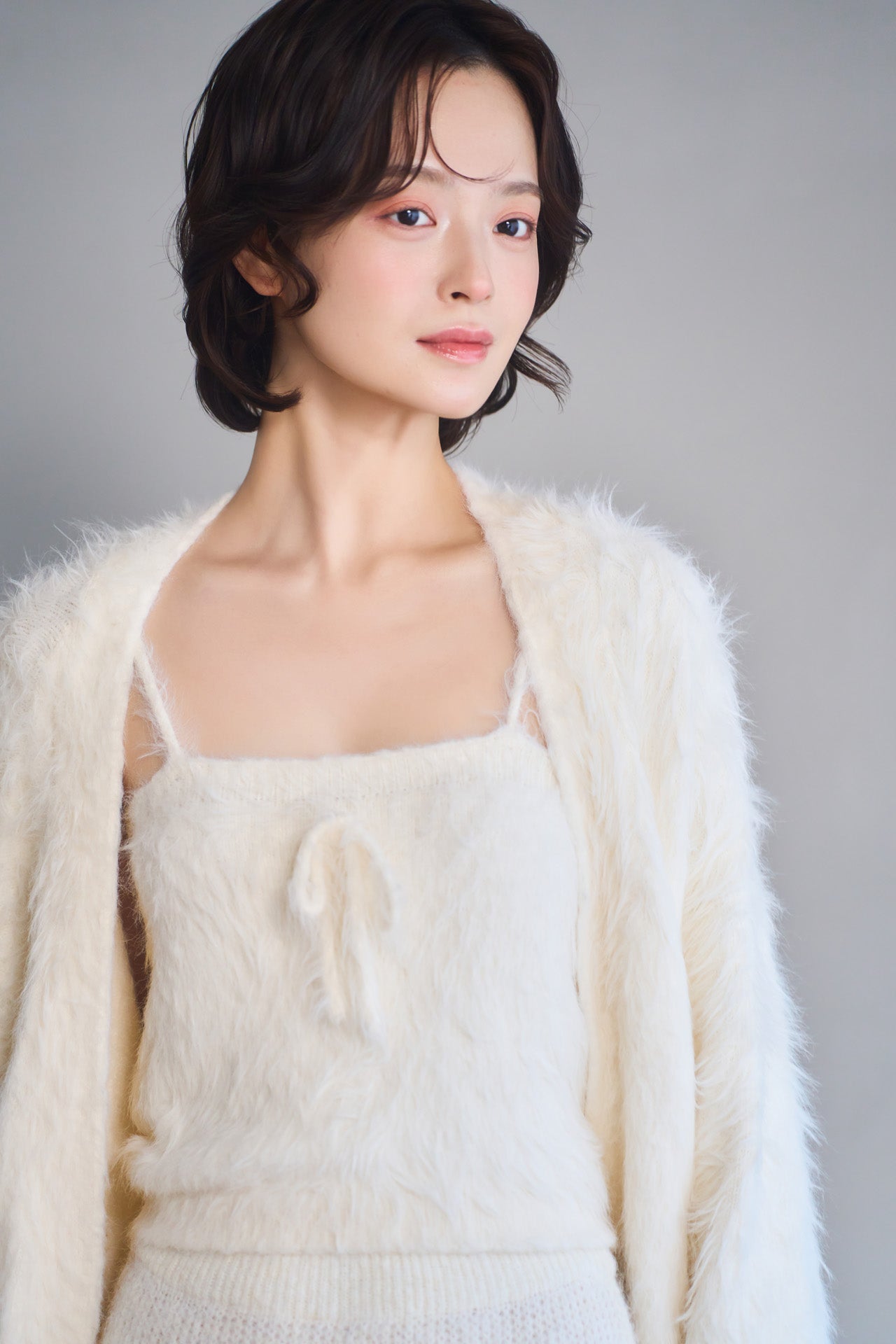 うさぎの毛のように柔らかく、触れたくなるシャギーニット素材を使用し、胸元にはリボンをあしらったキャミソールと、ゆるっと羽織れるカーディガンのセット。