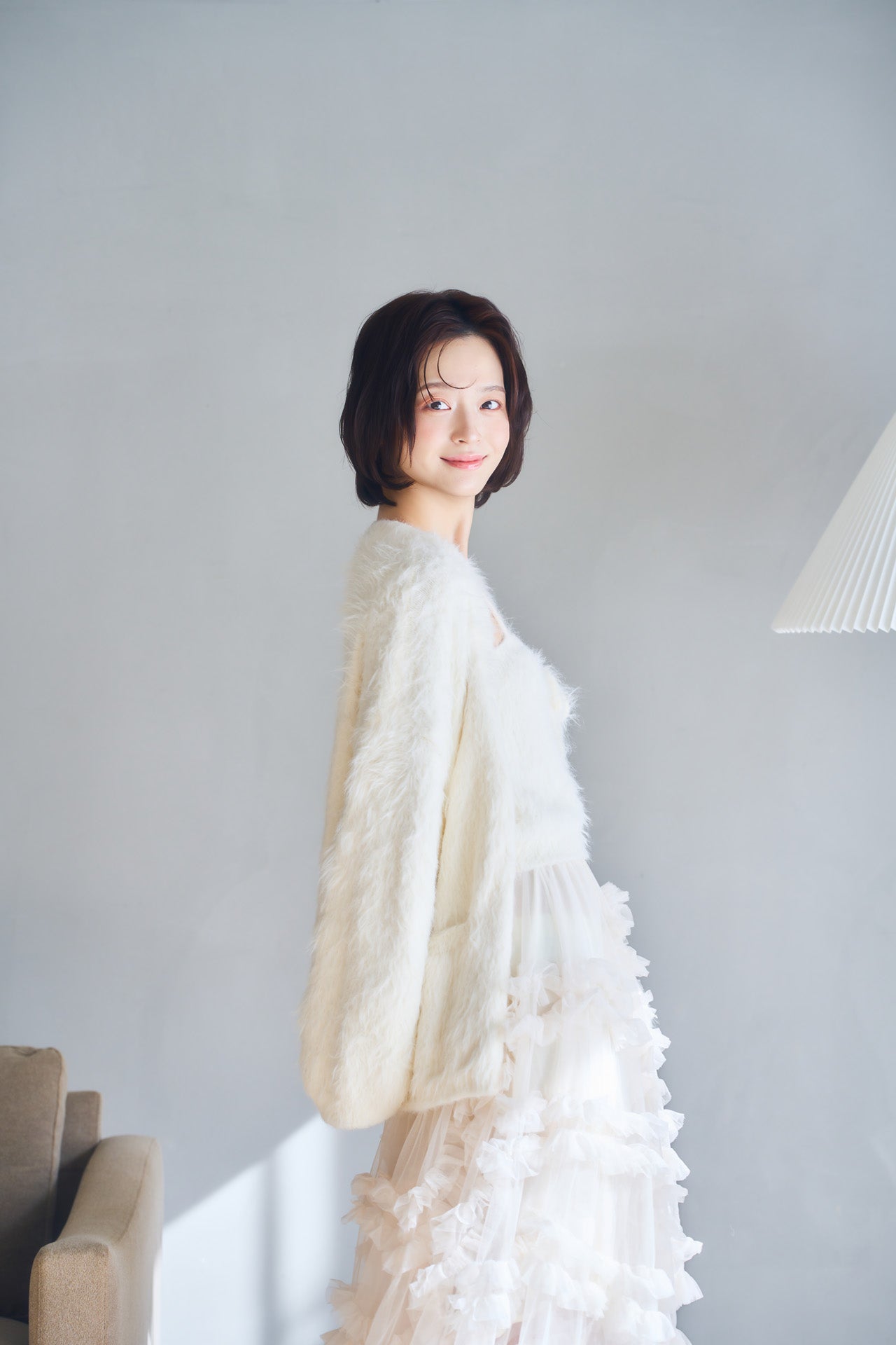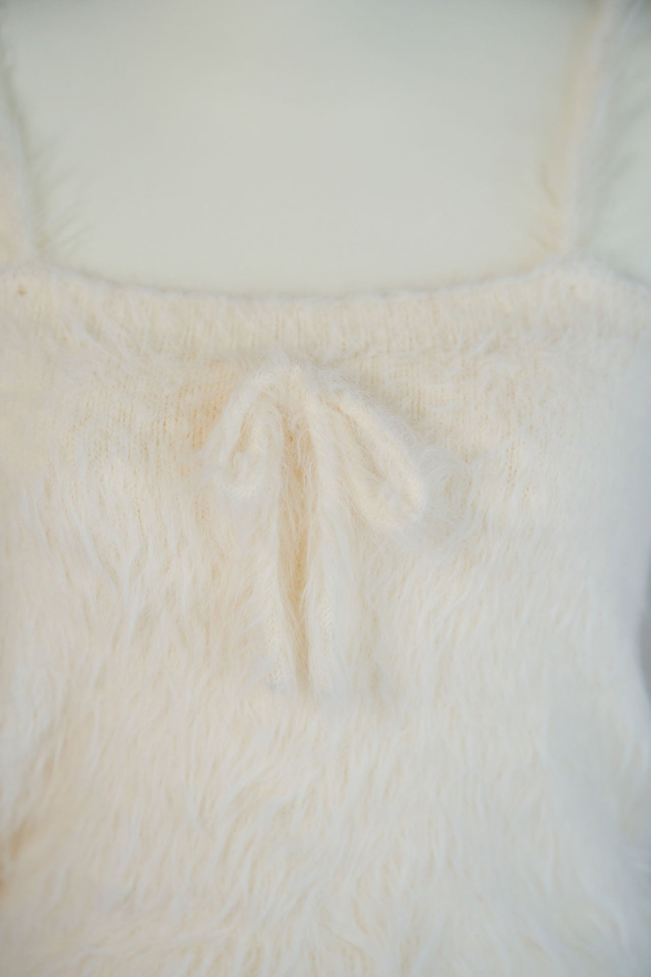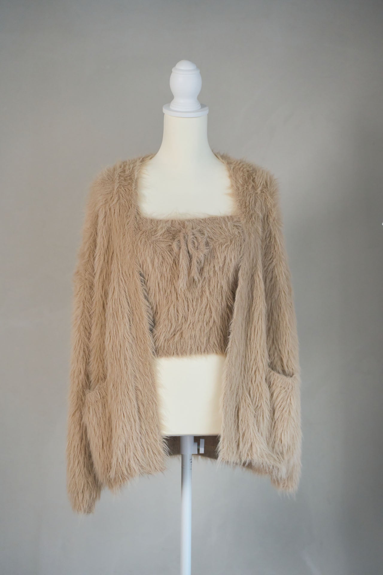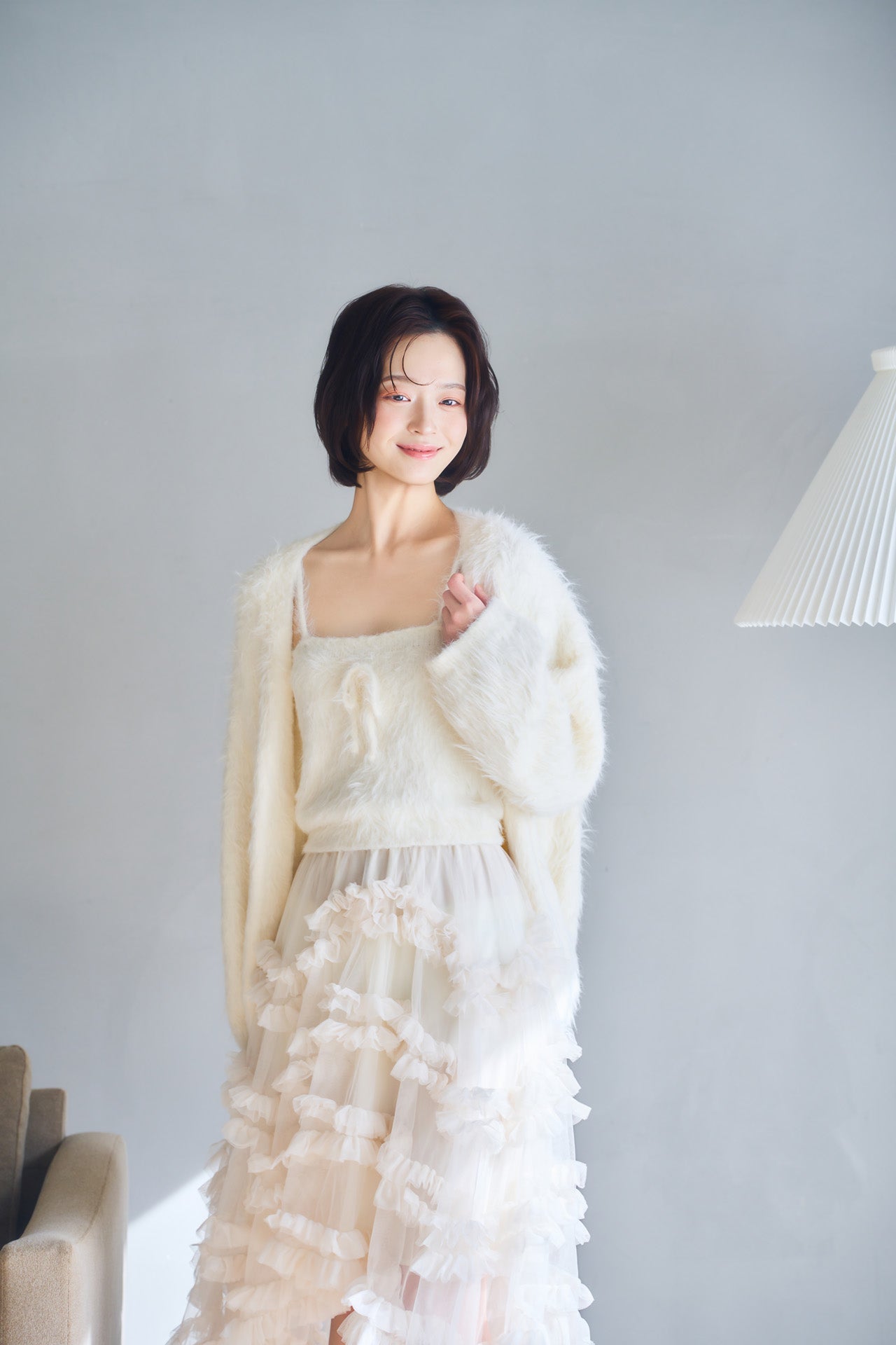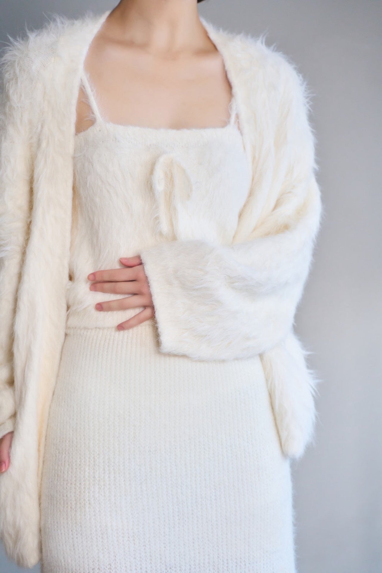 うさぎの毛のように柔らかく、触れたくなるシャギーニット素材を使用し、胸元にはリボンをあしらったキャミソールと、ゆるっと羽織れるカーディガンのセット。