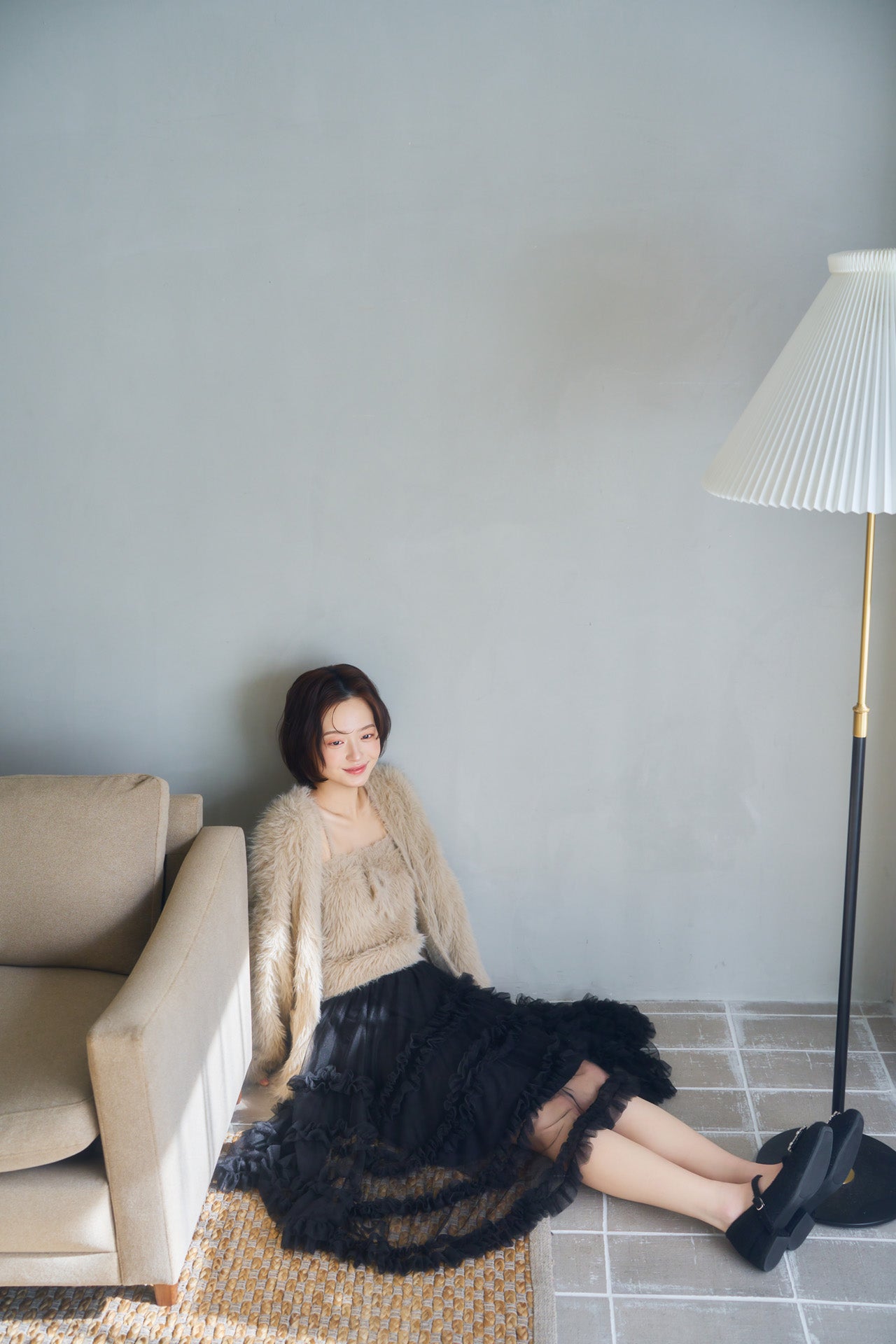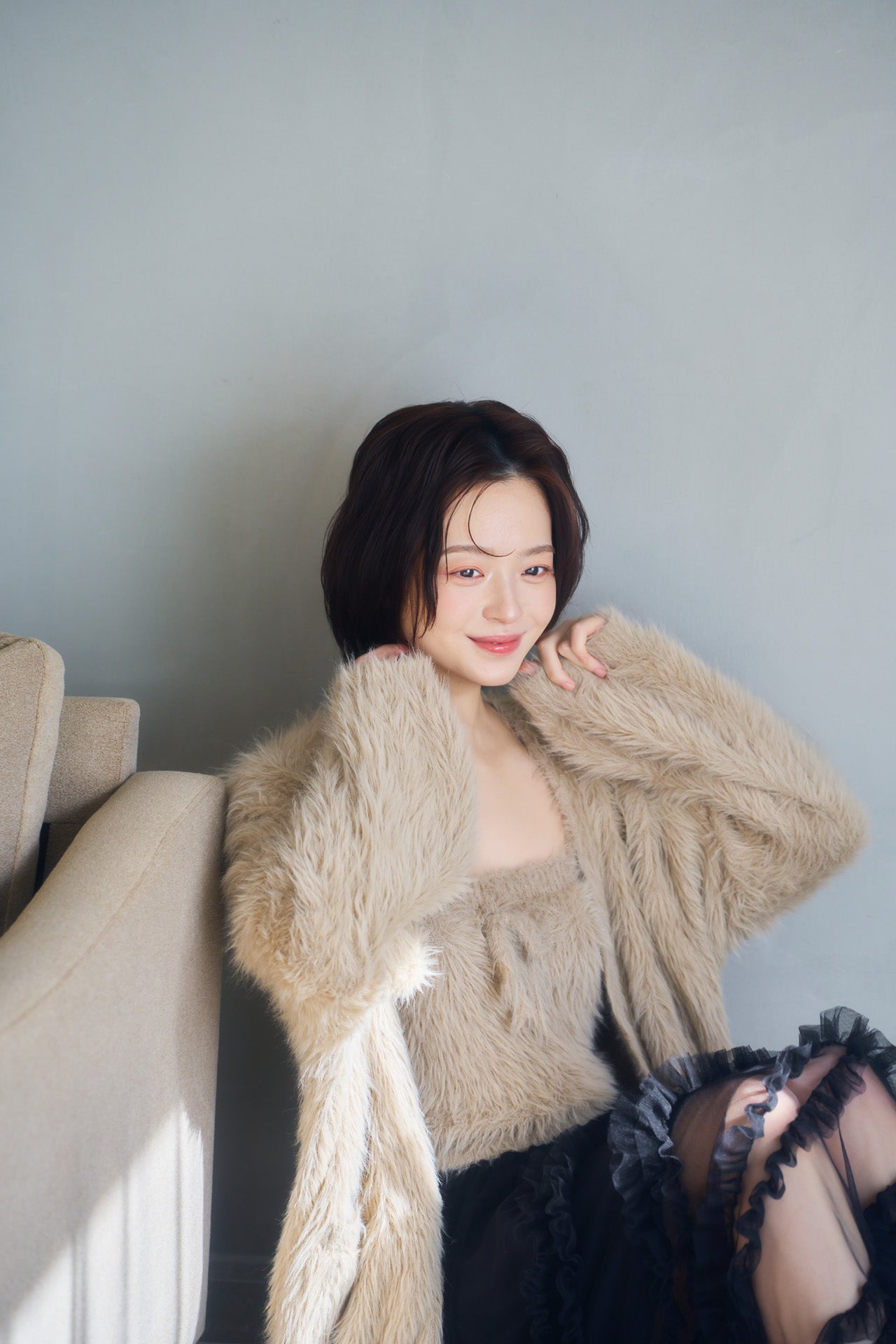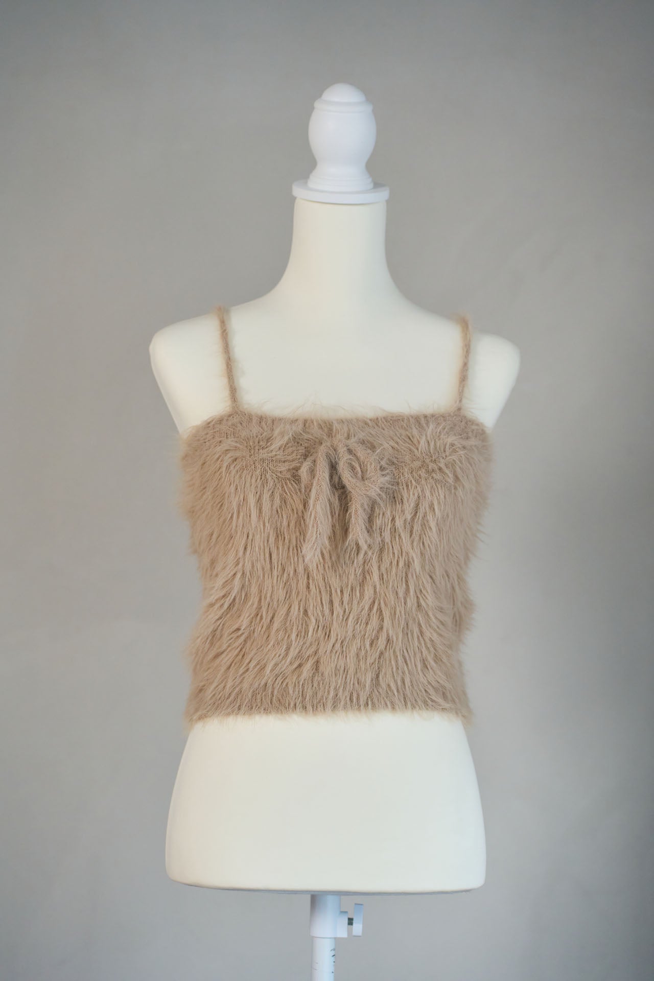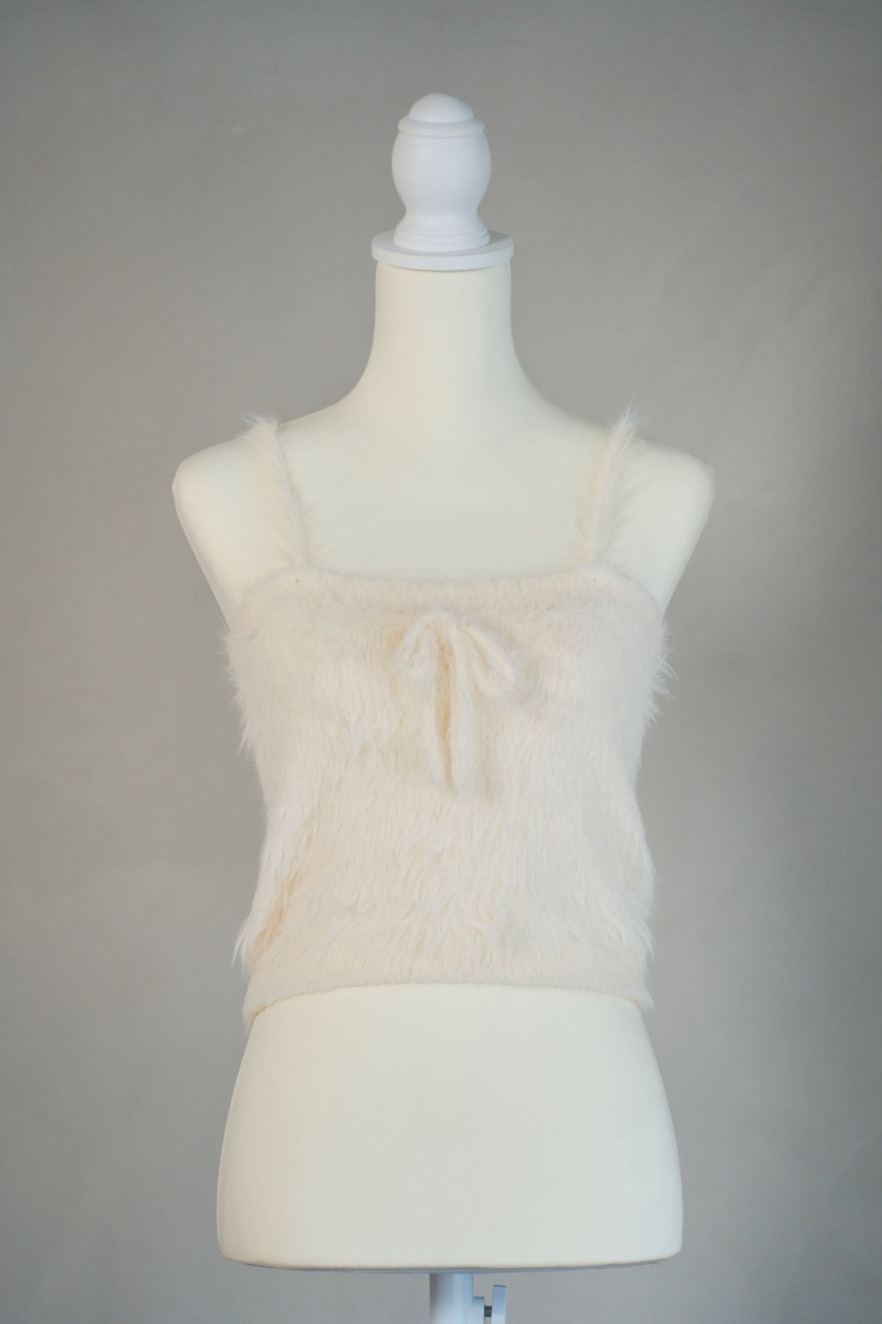 うさぎの毛のように柔らかく、触れたくなるシャギーニット素材を使用し、胸元にはリボンをあしらったキャミソールと、ゆるっと羽織れるカーディガンのセット。