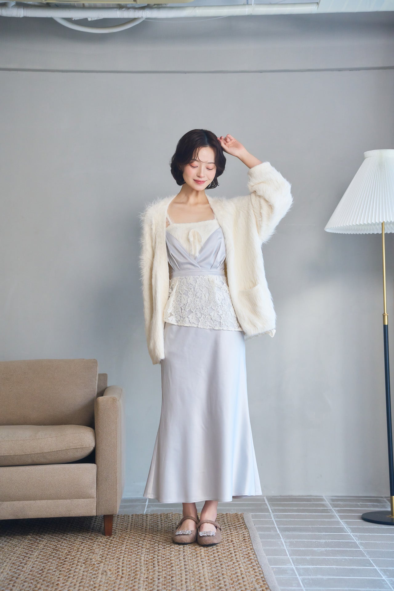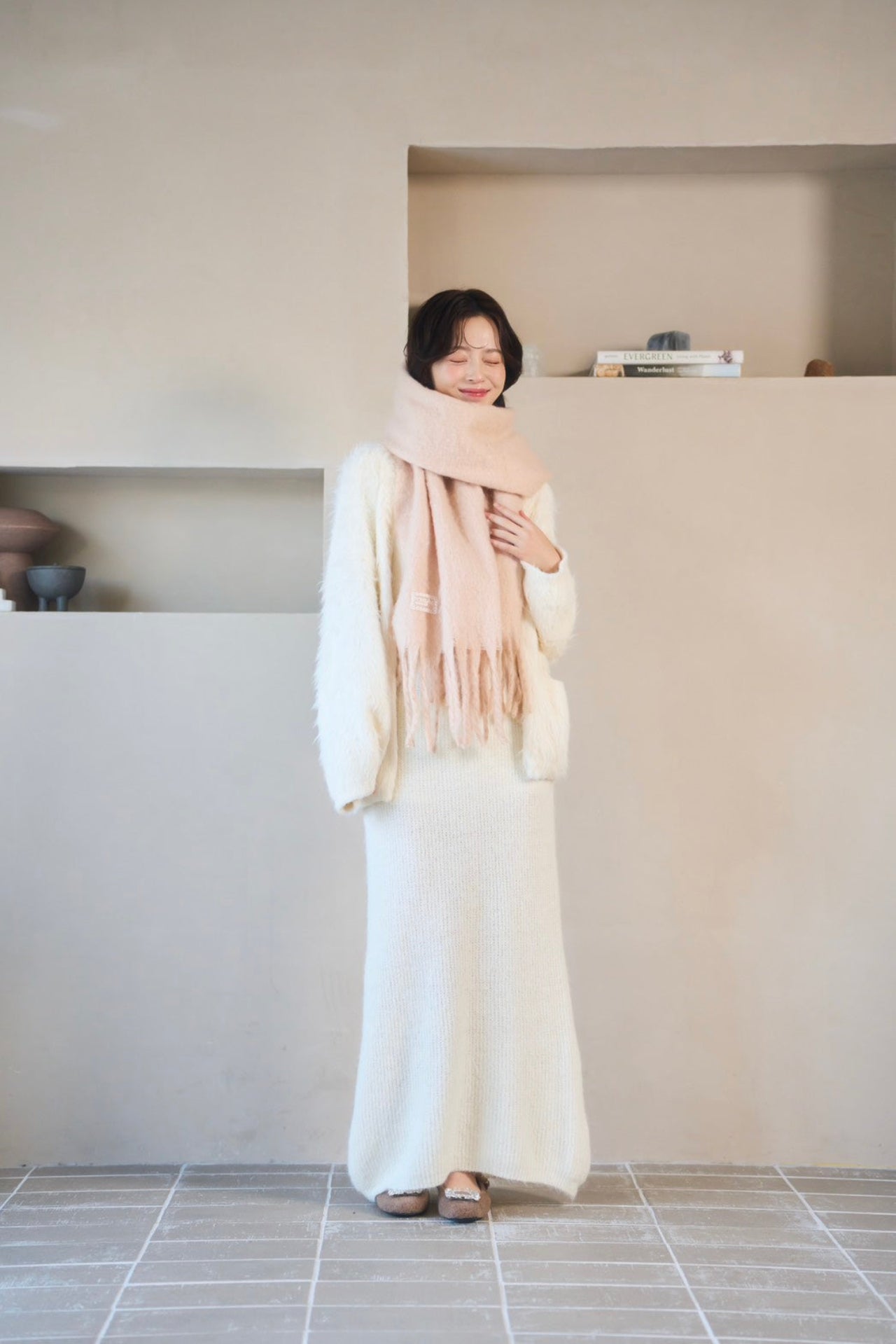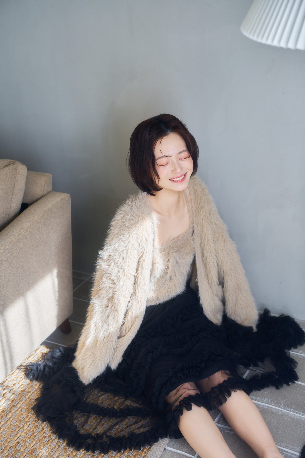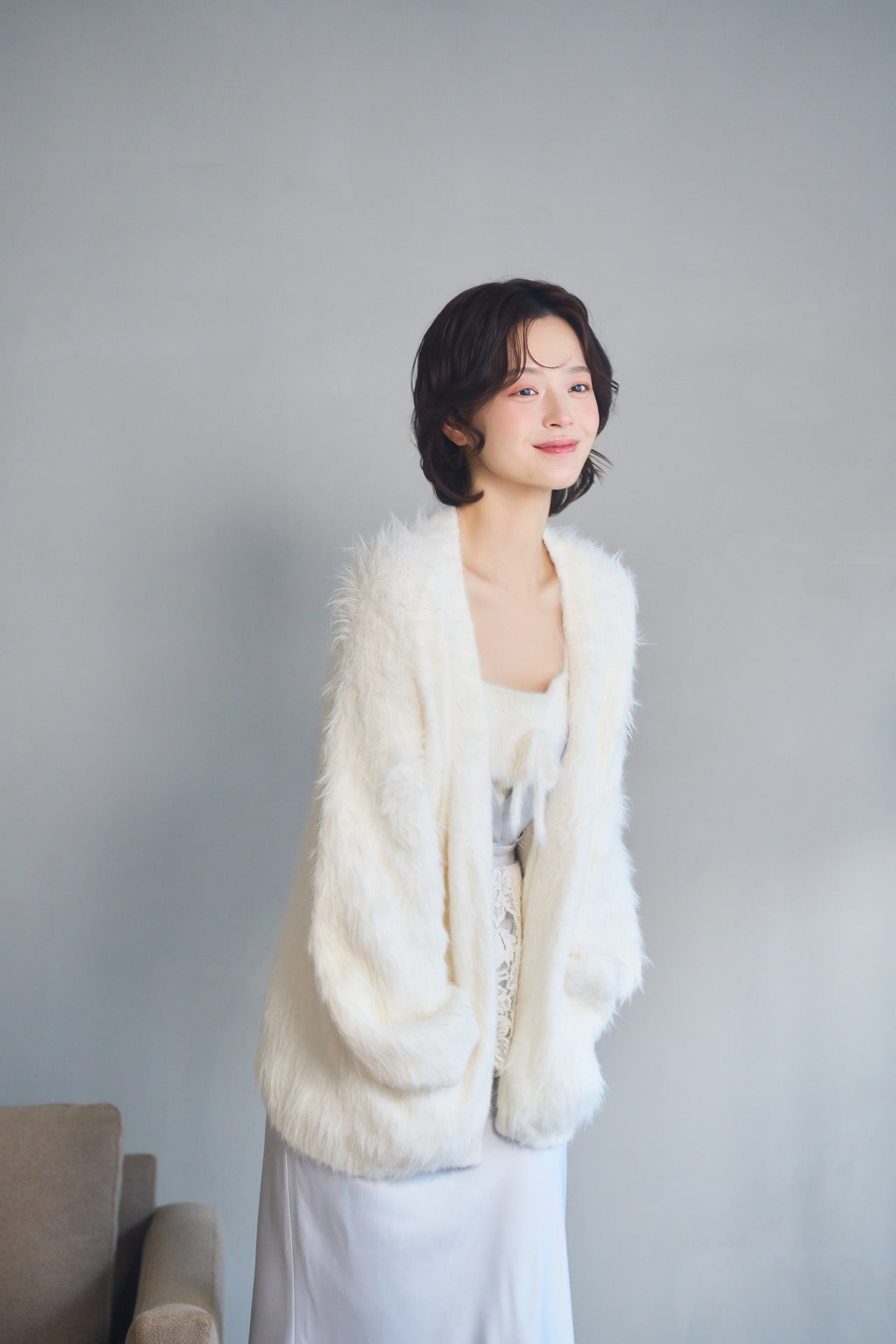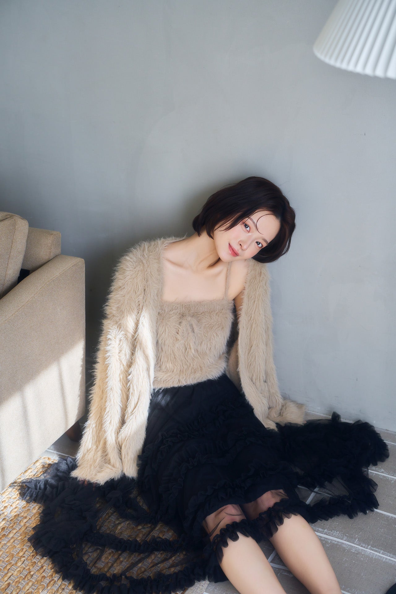 うさぎの毛のように柔らかく、触れたくなるシャギーニット素材を使用し、胸元にはリボンをあしらったキャミソールと、ゆるっと羽織れるカーディガンのセット。