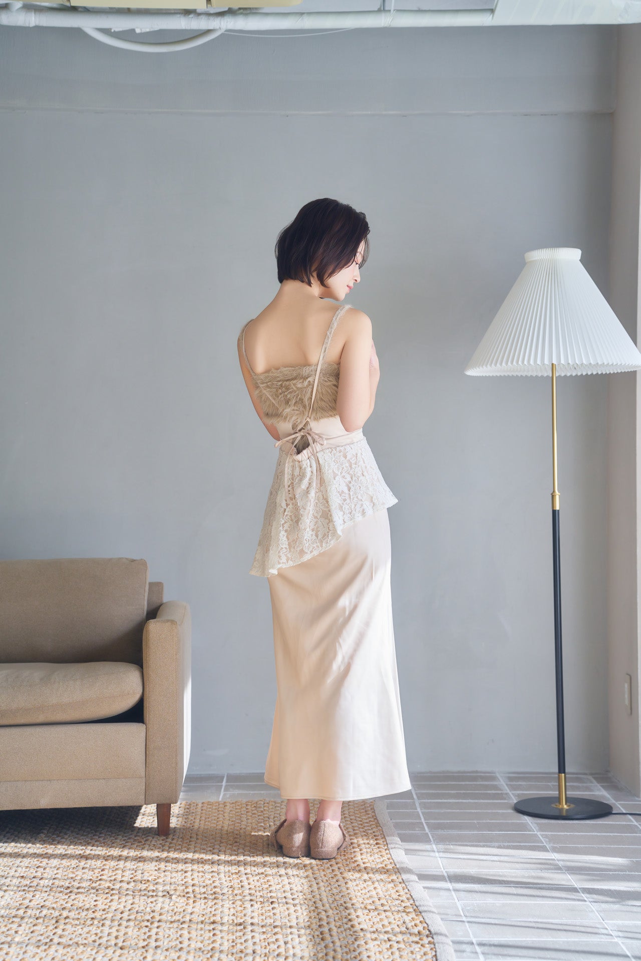キャミはコンパクトなシルエットでバランスが取りやすく、カーディガンは体を包み込むようなリラックス感がありながら、抜き襟で着ると自然な抜け感が生まれます。