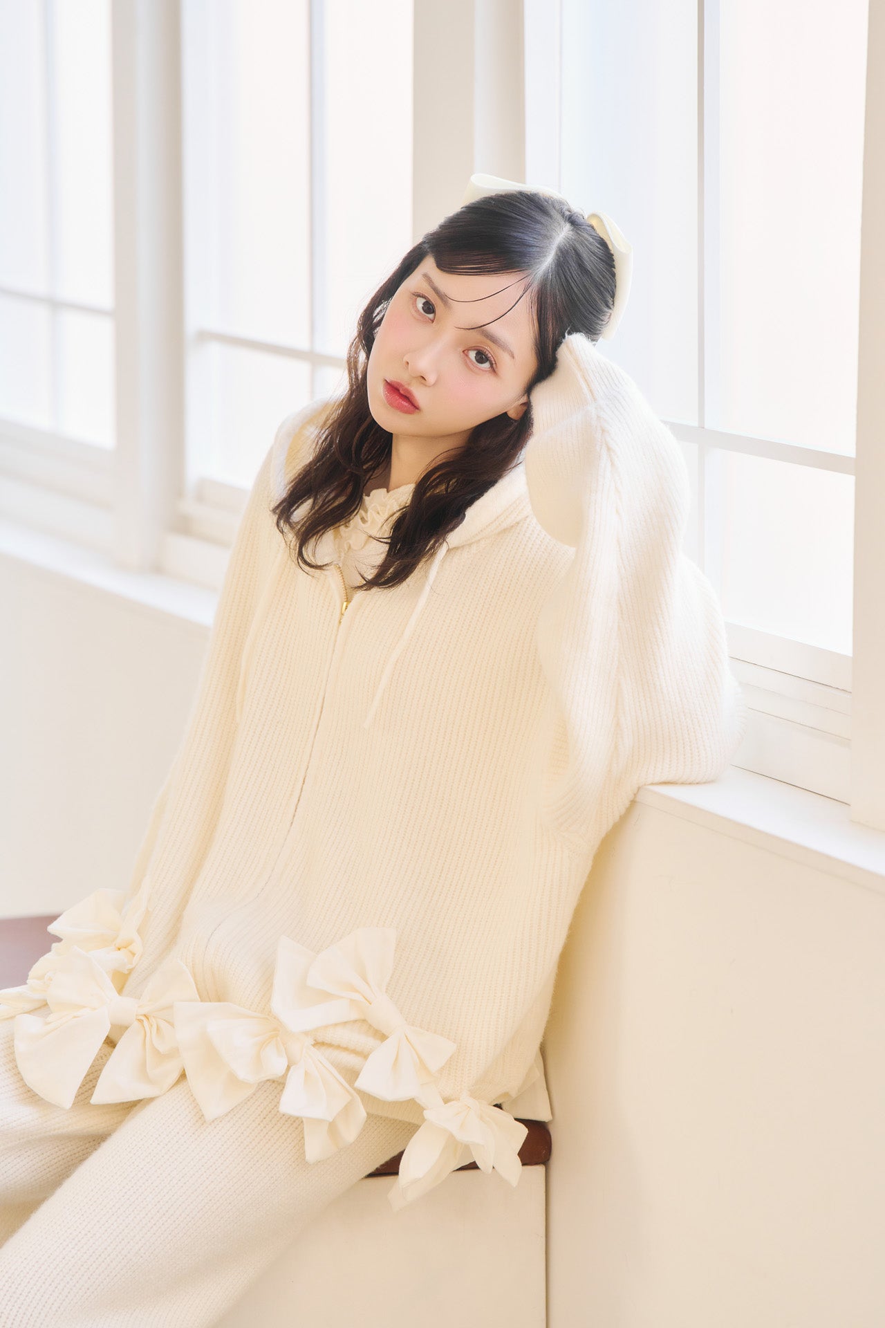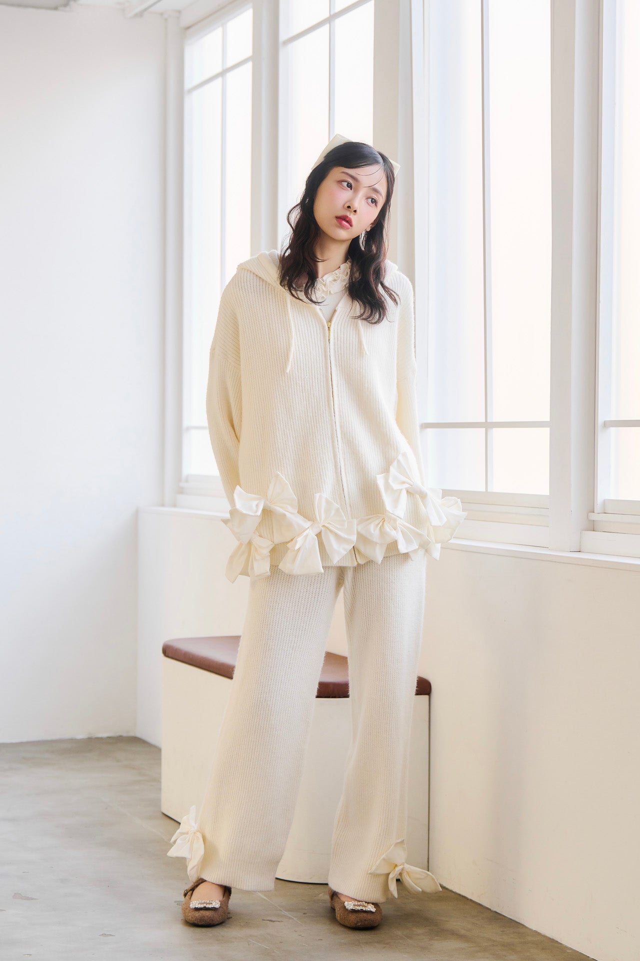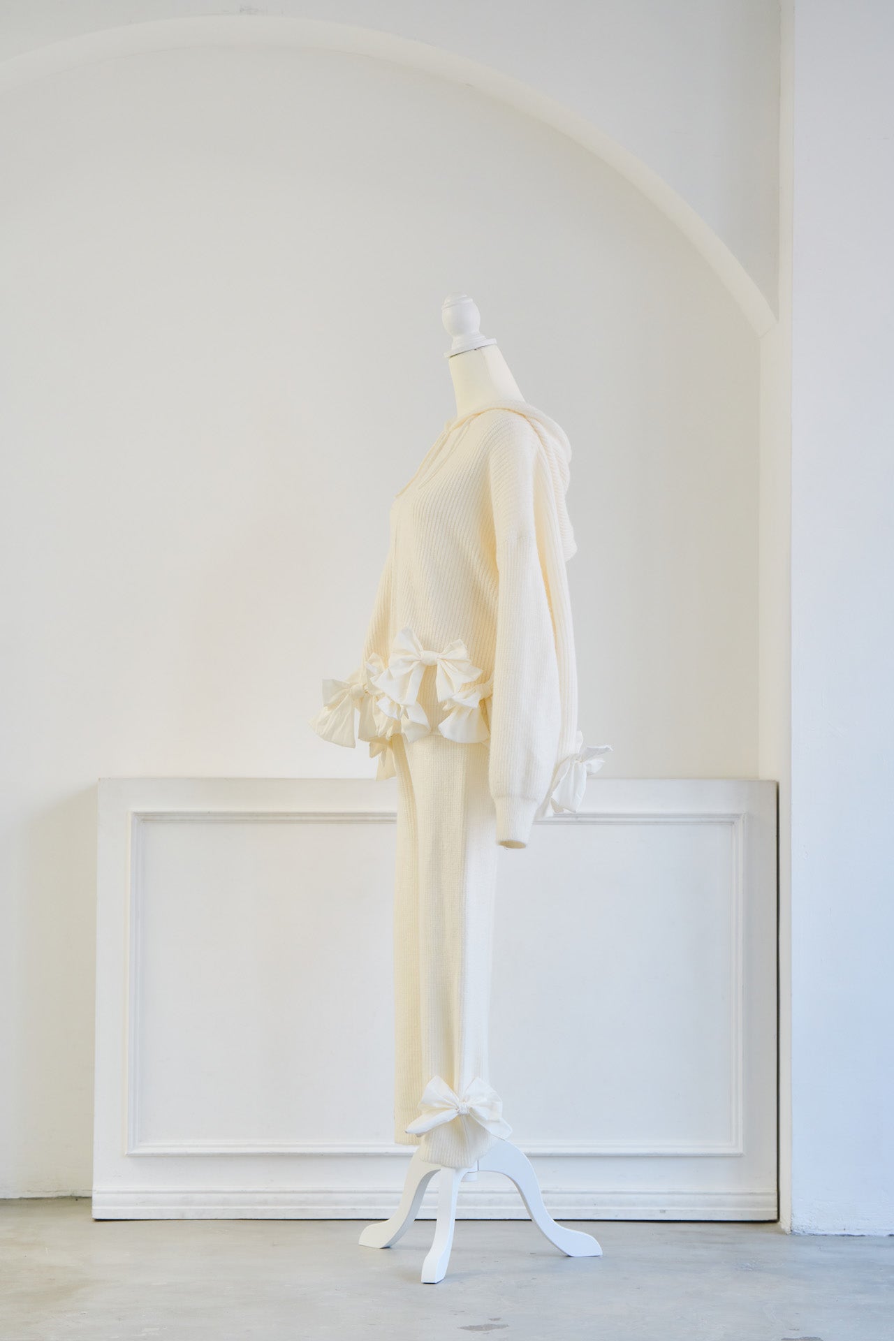 パーカーの前後とパンツの裾に施された立体的なリボンディテール。