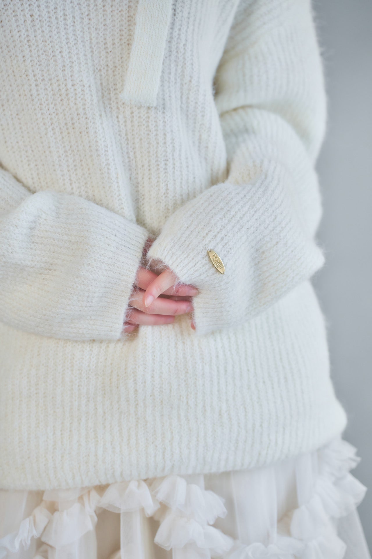 袖口にはブランドの金タグをさりげなく添え、