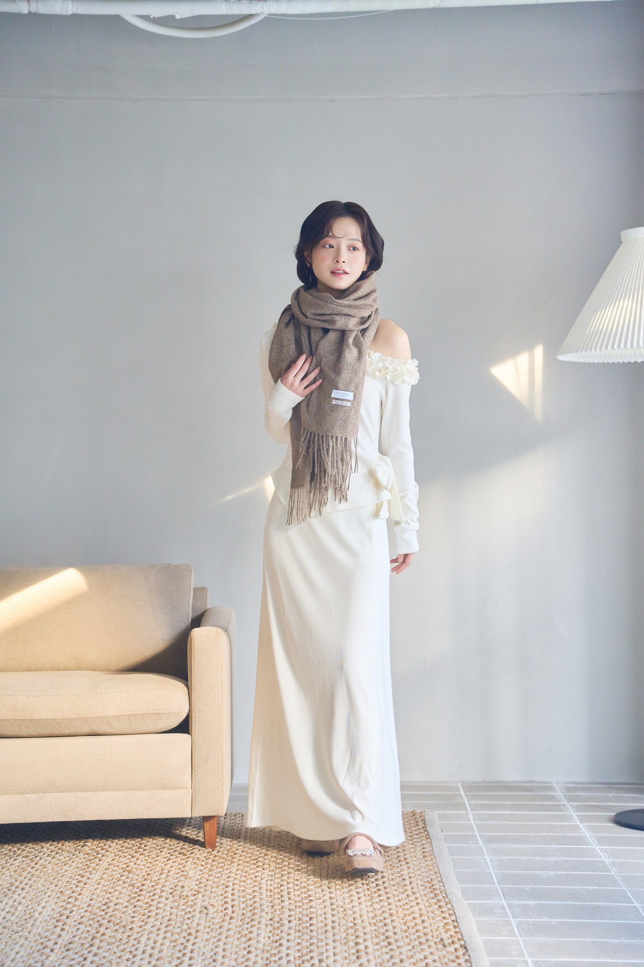 顔まわりに柔らかさと上品さを与え、巻くだけでスタイルに奥行きをプラス。